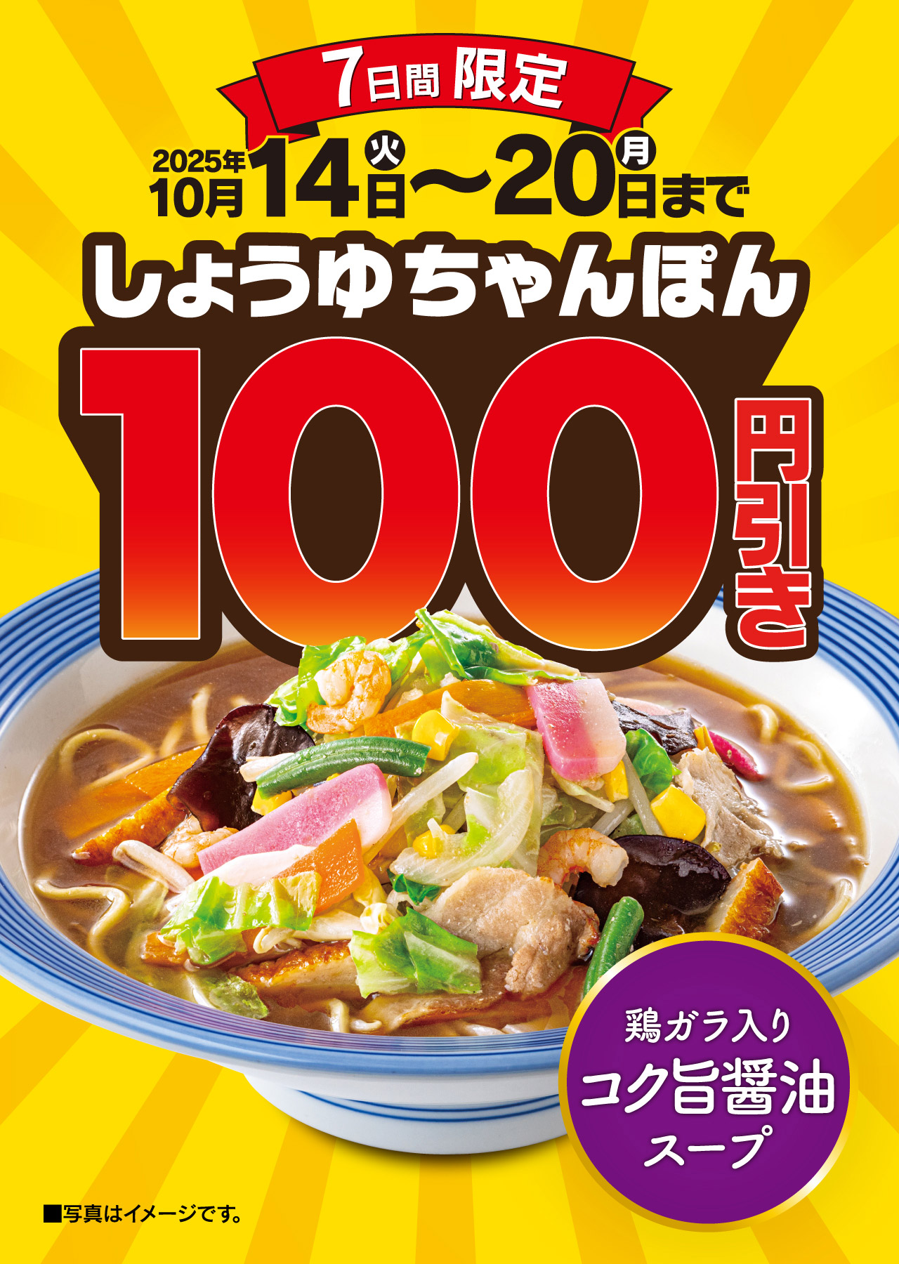 キャンペーン TOP > キャンペーン > しょうゆちゃんぽん100円引きキャンペーン しょうゆちゃんぽん100円引きキャンペーン開催中! 2025年10月14日(火)~2025年10月20日(月)まで 10月14日(火)~10月20日(月)の7日間だけのお得なキャンペーンを開催中です。 **全国のリンガーハットでしょうゆちゃんぽんが100円引き!** この機会にぜひご賞味ください。 商品詳細はこちら ※写真はイメージです。