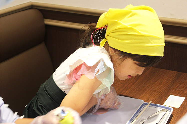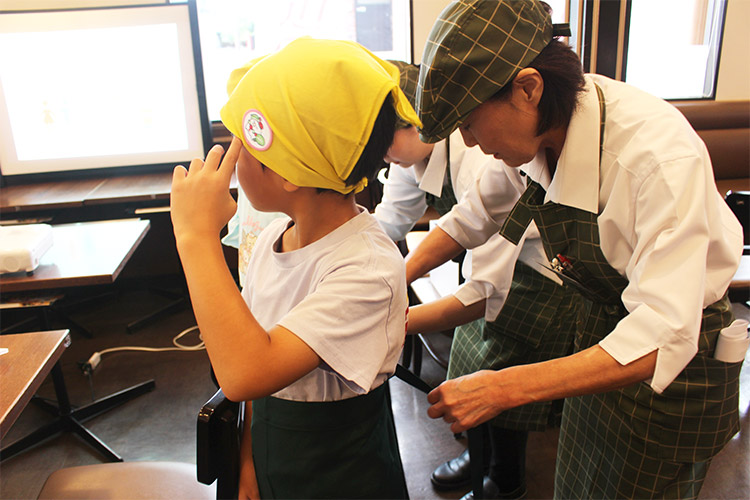 まずはお店の人に手伝ってもらいながら、三角巾・エプロンをつけていきます。