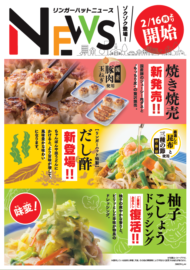 また、引き続きお客様にお食事を楽しんでいただくために、新しいサイドメニュー「焼き焼売」のご提供や、お好みでお使いいただける卓上調味料に「リンガーハット特製だし酢」が登場します。そして野菜たっぷりシリーズのドレッシングに、過去好評だった「柚子こしょうドレッシング」を復活いたします。