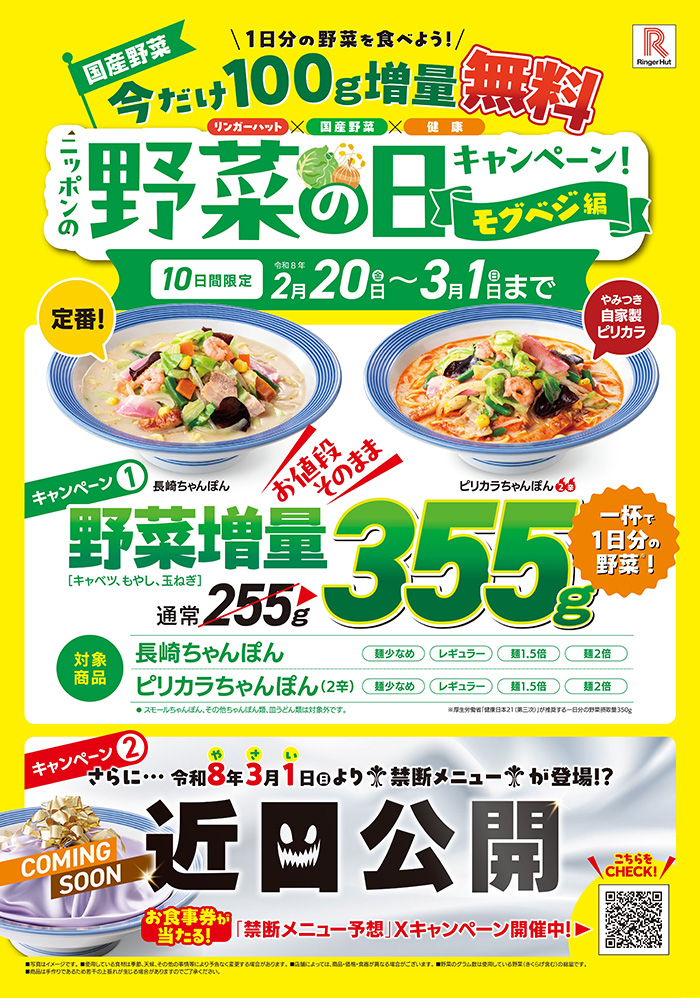 全国の長崎ちゃんぽん専門店「リンガーハット」にて、令和8年3月1日(日)の「野菜の日」に先立ち、2月20日(金)~3月1日(日)の10日間限定で「ニッポンの!野菜の日キャンペーン -モグベジ編-」を実施いたします。